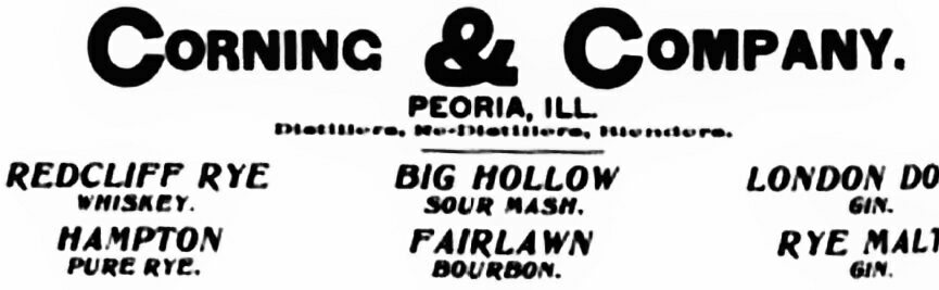 1851年に生まれたフランクリン・トレイシー・コーニングはオハイオ州に深く根を下ろした家族の一員でした。彼の祖父は1813年頃、ニューハンプシャーからオハイオ北部へ6頭チームの屋根付き馬車で移住しました。草分け的な開拓者として重きをなしたカーネル・コーニングは事業を成功させ、子孫と共に富を築き、そのうちの何人かは蒸留業に携わっていたようです。フランクリンは裕福な実業家の父によって建てられたクリーヴランドの邸宅で育ち、兄のウォーレン・ホームズ・コーニングは父親と共同で酒類事業に参入していました。1870年の国勢調査では、ウォーレンは酒類卸売業者としてリストされ、 19歳のフランクリンはその店員として雇われていたらしい。この間、父親はコーニング・アンド・カンパニーの事業を拡大していました。クリーヴランドは原材料の入手先である大規模な穀物ベルトから離れていたため、イリノイ州ピオリアにウォーレンをマネージャーとして支店が設立されます。しかし、ウォーレンは運営を指揮しつつもクリーヴランドに住み続けました。どうやら彼はこのアレンジメントで管理するのが難しいと判断したようで、フランクリンをピオリアに派遣して家族の利益となる経営を任せます。それまでの間に若きフランクリンは、友人や家族に「ファニー」と呼ばれていたフランシス・デフォレストと結婚していました。1875年5月、彼が24歳で彼女は21歳の時です。彼らはおそらく1880年頃、ピオリアの新しい環境に落ち着きました。後のどこかの段階で弟のチャールズも蒸留業に参加したと思われます。こうしてピオリアは彼らの活動の中心となって行きました。